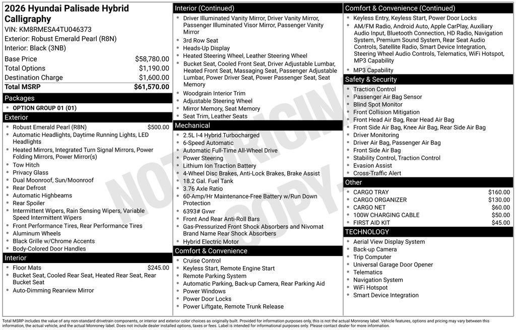Robust Emerald Pearl 2026 Hyundai Palisade Hybrid Calligraphy AWD 6-Speed Automatic 2.5L Turbocharged GDI 4-Cylinder Hybrid 2.5L Turbocharged GDI 4-Cylinder Hybrid.