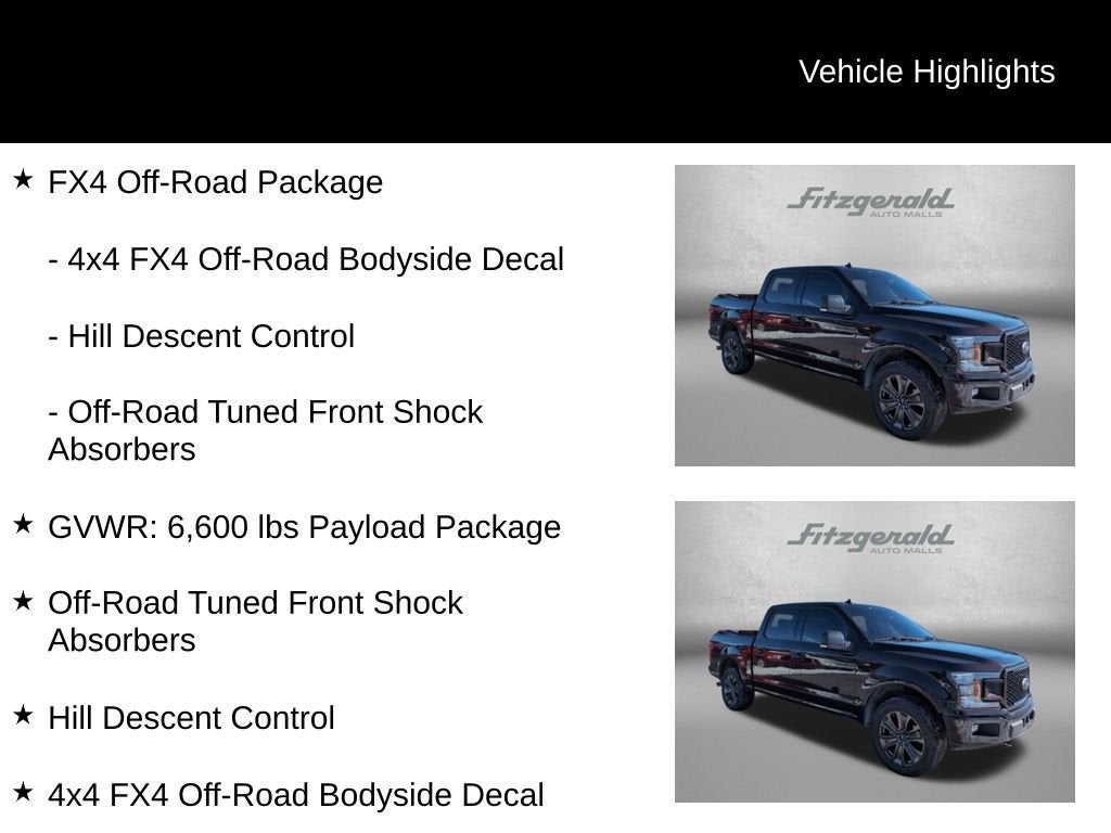 2018 Magma Red Metallic Ford F-150 10-Speed Automatic 4WD, 4x4 FX4 Off-Road Bodyside Decal, FX4 Off-Road Package, GVWR: 6,600 lbs Payload Package, Hill Descent Control, Off-Road Tuned Front Shock Absorbers. 2.7L V6 EcoBoost XLT You will love our NO HAGGLE, NO HASSLE PRICING here at Fitzgerald Auto Mall. Ask us about our BUYER PROTECTION PLAN, LOANER CAR PROGRAMS, AND FREE Vehicle History Report. Can not find what you want?? NO PROBLEM! We have over 1,000 Pre-Owned vehicles available at WWW.FITZMALL.COM. You can also visit us in person at 114 Baughmans Lane Frederick MD, 21702 or Call Us @240-629-7301.