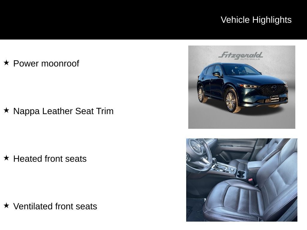 2022 Deep Crystal Blue Mica Mazda CX-5 6-Speed Automatic Heated front seats, Nappa Leather Seat Trim, Power moonroof, Ventilated front seats. 2.5L I4 2.5 Turbo Signature You will love our NO HAGGLE, NO HASSLE PRICING here at Fitzgerald Auto Mall. Ask us about our BUYER PROTECTION PLAN, LOANER CAR PROGRAMS, AND FREE Vehicle History Report. Can not find what you want?? NO PROBLEM! We have over 1,000 Pre-Owned vehicles available at WWW.FITZMALL.COM. You can also visit us in person at 114 Baughmans Lane Frederick MD, 21702 or Call Us @240-629-7301.