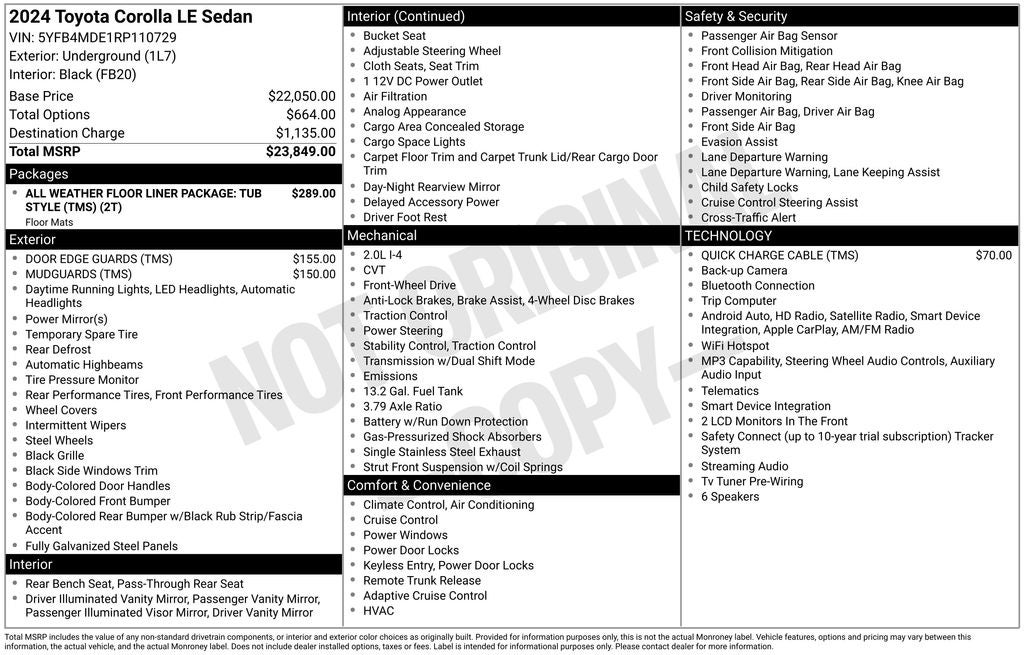 Underground LE FWD CVT 2.0L I4 DOHC 16V Back Up Camera, Bluetooth®, 16 Steel Wheels w/Covers, 4-Wheel Disc Brakes, 6 Speakers, ABS brakes, Air Conditioning, AM/FM radio: SiriusXM, Auto High-beam Headlights, Automatic temperature control, Brake assist, Dual front impact airbags, Dual front side impact airbags, Electronic Stability Control, Emergency communication system: Safety Connect (up to 10-year trial subscription), Exterior Parking Camera Rear, Front anti-roll bar, Front Center Armrest, Front wheel independent suspension, Fully automatic headlights, Knee airbag, Low tire pressure warning, Occupant sensing airbag, Overhead airbag, Panic alarm, Passenger door bin, Power door mirrors, Radio: 8 Toyota Audio Multimedia, Rear anti-roll bar, Rear side impact airbag, Rear window defroster, Remote keyless entry, Speed control, Split folding rear seat, Steering wheel mounted audio controls, Telescoping steering wheel, Tilt steering wheel, Traction control.