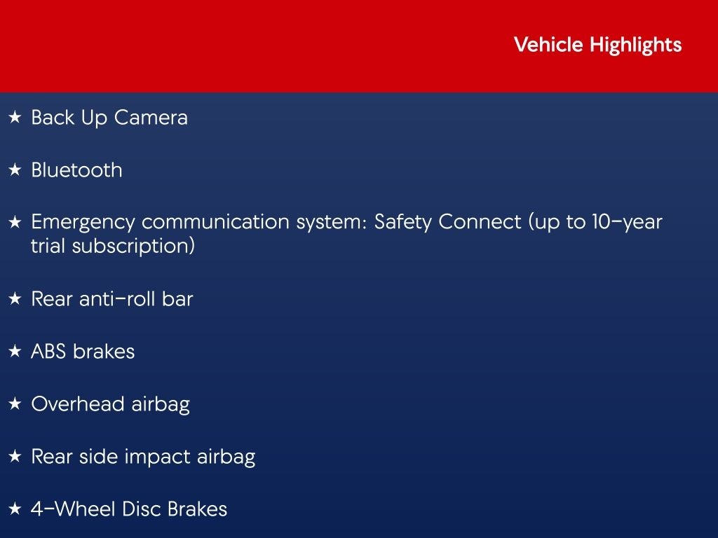 - Emergency SOS Capable Safety Connect (up to 10-year trial subscription) vehicle integrated emergency SOS system