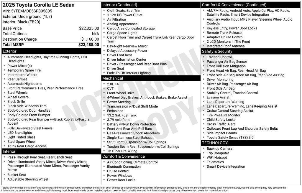 Underground LE FWD CVT 2.0L I4 DOHC 16V Back Up Camera, Bluetooth®, Clean History Report, a Clean, One Owner Carfax, 4-Wheel Disc Brakes, 6 Speakers, ABS brakes, Air Conditioning, AM/FM radio: SiriusXM, Apple CarPlay/Android Auto, Auto High-beam Headlights, Automatic temperature control, Brake assist, Dual front impact airbags, Dual front side impact airbags, Electronic Stability Control, Emergency communication system: Safety Connect (up to 10-year trial subscription), Exterior Parking Camera Rear, Front anti-roll bar, Front Center Armrest, Front wheel independent suspension, Fully automatic headlights, Knee airbag, Low tire pressure warning, Occupant sensing airbag, Overhead airbag, Panic alarm, Passenger door bin, Power door mirrors, Radio: 8 Toyota Audio Multimedia, Rear anti-roll bar, Rear side impact airbag, Rear window defroster, Remote keyless entry, Split folding rear seat, Steering wheel mounted audio controls, Telescoping steering wheel, Tilt steering wheel, Traction control, Wheels: 16 Steel with Covers.