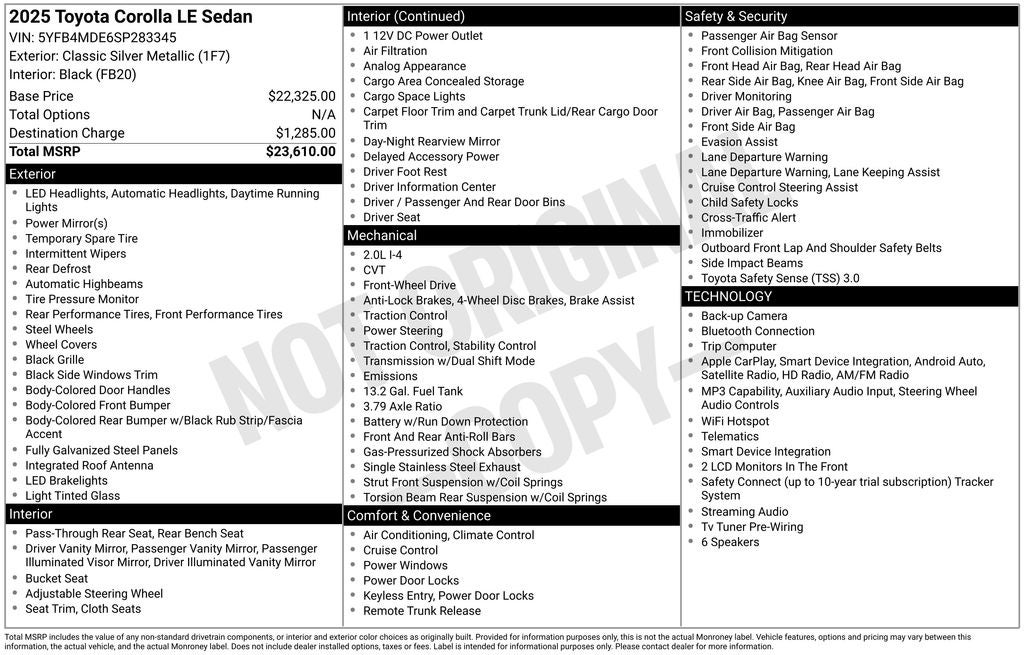 Classic Silver Metallic LE FWD CVT 2.0L I4 DOHC 16V 4-Wheel Disc Brakes, 6 Speakers, Air Conditioning, AM/FM radio: SiriusXM, Apple CarPlay/Android Auto, Auto High-beam Headlights, Automatic temperature control, Brake assist, Bumpers: body-color, Driver door bin, Driver vanity mirror, Dual front side impact airbags, Electronic Stability Control, Emergency communication system: Safety Connect (up to 10-year trial subscription), Exterior Parking Camera Rear, Fabric Seat Trim, Front Bucket Seats, Front Center Armrest, Front reading lights, Illuminated entry, Outside temperature display, Passenger door bin, Passenger vanity mirror, Power door mirrors, Power windows, Radio data system, Radio: 8 Toyota Audio Multimedia, Rear side impact airbag, Rear window defroster, Steering wheel mounted audio controls, Traction control.