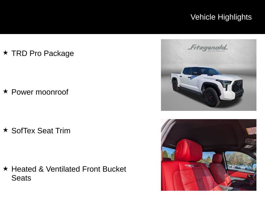 2025 Ice Cap Toyota Tundra Hybrid 10-Speed Automatic 3.4L V6, Heated & Ventilated Front Bucket Seats, Power moonroof, SofTex Seat Trim, TRD Pro Package. 3.4L V6 TRD Pro You will love our NO HAGGLE, NO HASSLE PRICING here at Fitzgerald Auto Mall. Ask us about our BUYER PROTECTION PLAN, LOANER CAR PROGRAMS, AND FREE Vehicle History Report. Can not find what you want?? NO PROBLEM! We have over 1,000 Pre-Owned vehicles available at WWW.FITZMALL.COM. You can also visit us in person at 114 Baughmans Lane Frederick MD, 21702 or Call Us @240-629-7301.